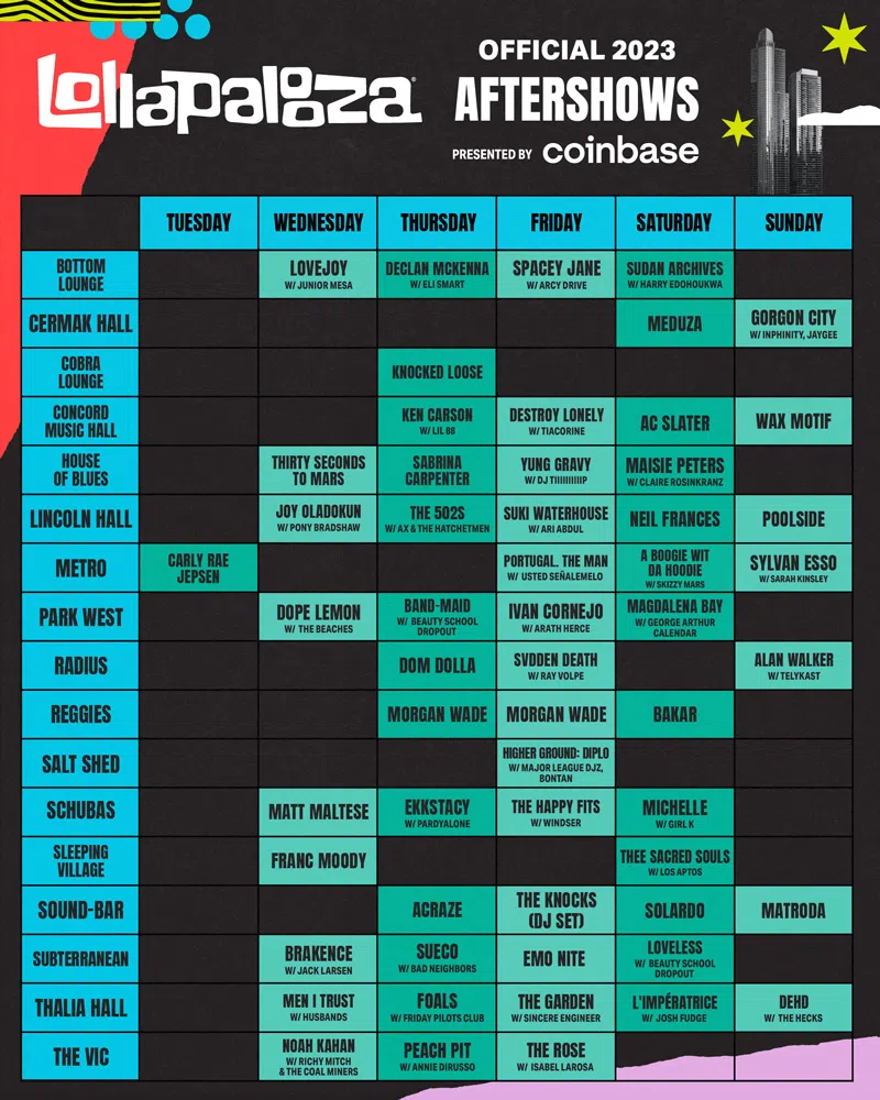 Are you headed down to Chicago for Lollapalooza August 3rd-6th? If so, your days of music just got longer. The Lolla Aftershows schedule has been released. I’m pretty sure we’ll get more after shows announcements soon. So far, the aftershow lineups look amazing.